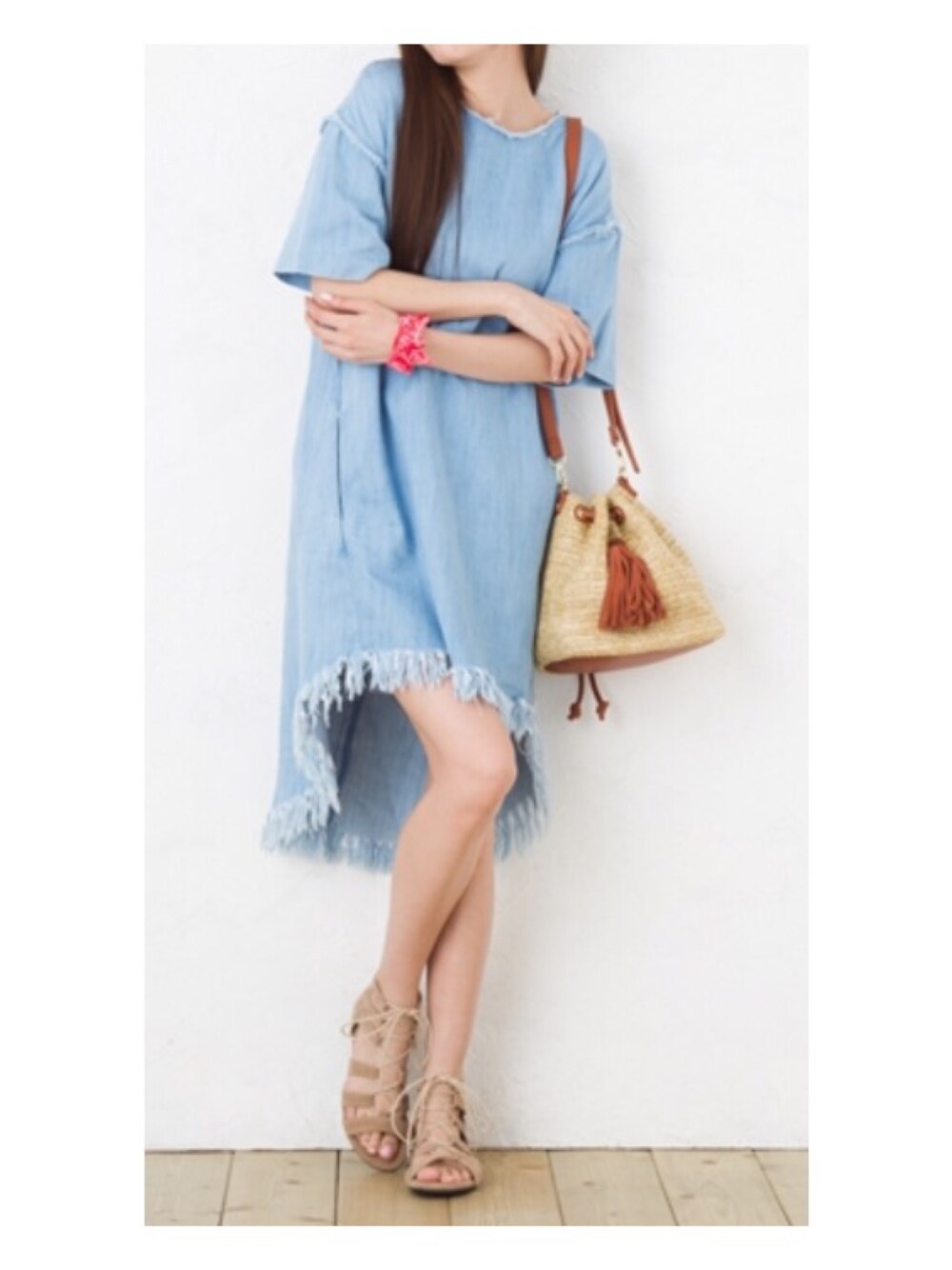 初夏のイメージ 前はミニ丈から後ろに長くなってるザラのワンピース サンダルは、レースアップサンダルで‼️ ポイントに赤を入れたくなるタイプです‼️