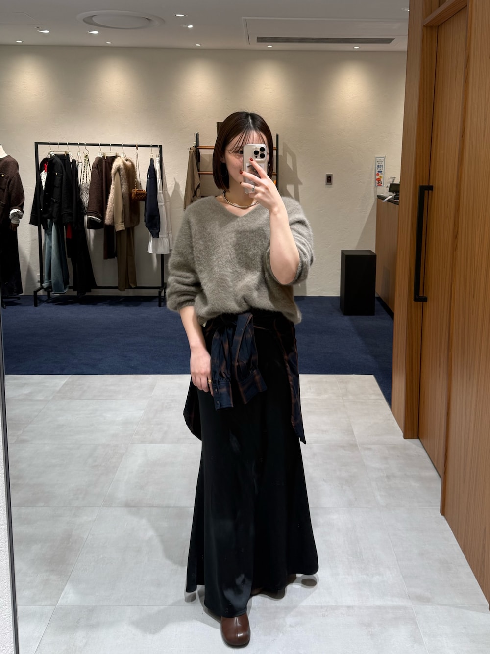 チクチク感のない肌触りのいいニット✨ スカート合わせで、腰にチェックシャツを巻くとシンプルすぎないスタイリングになるのでおすすめです!