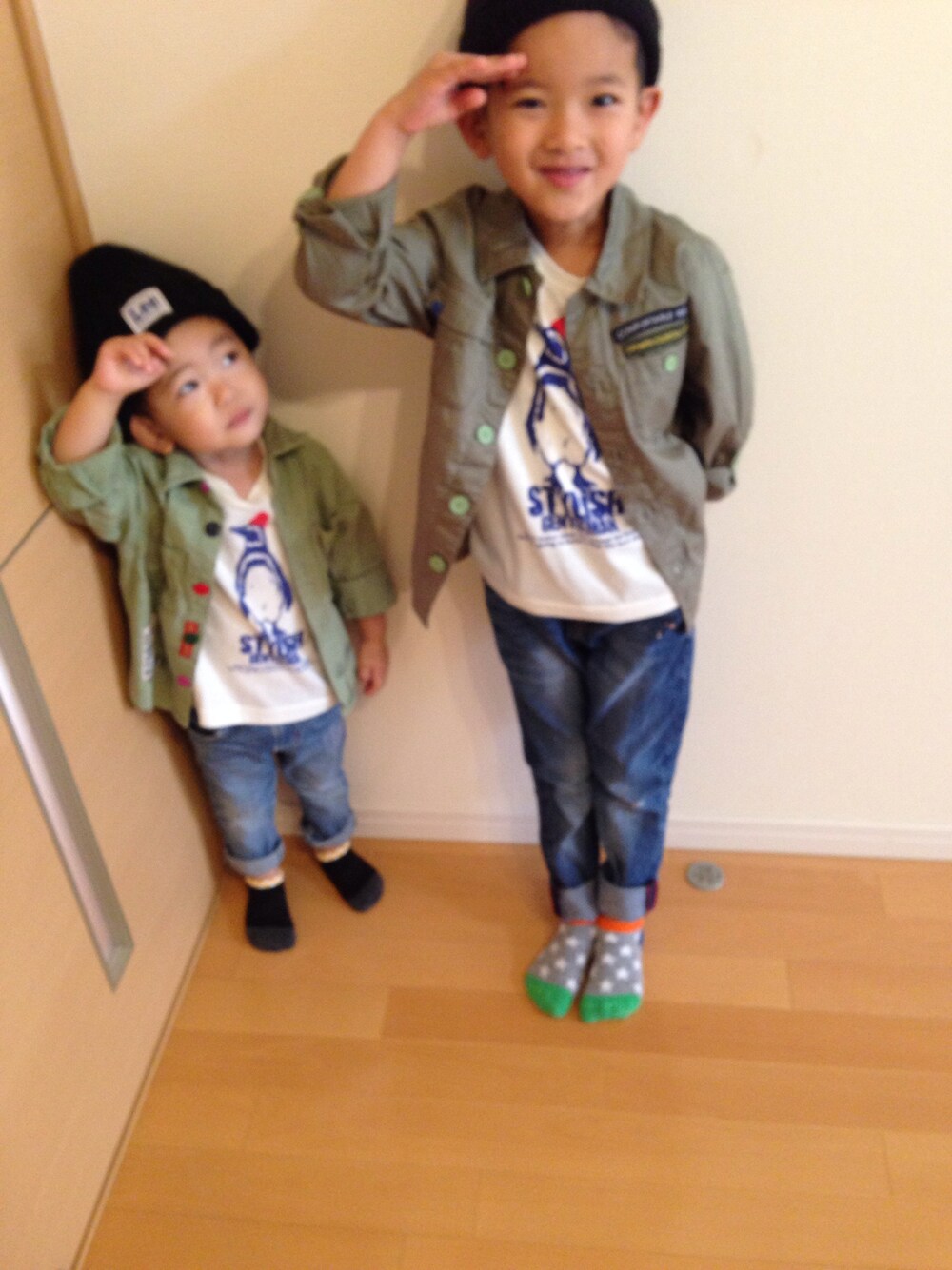兄弟お揃いコーデ 弟はTシャツ以外全ておさがりー(O_O)