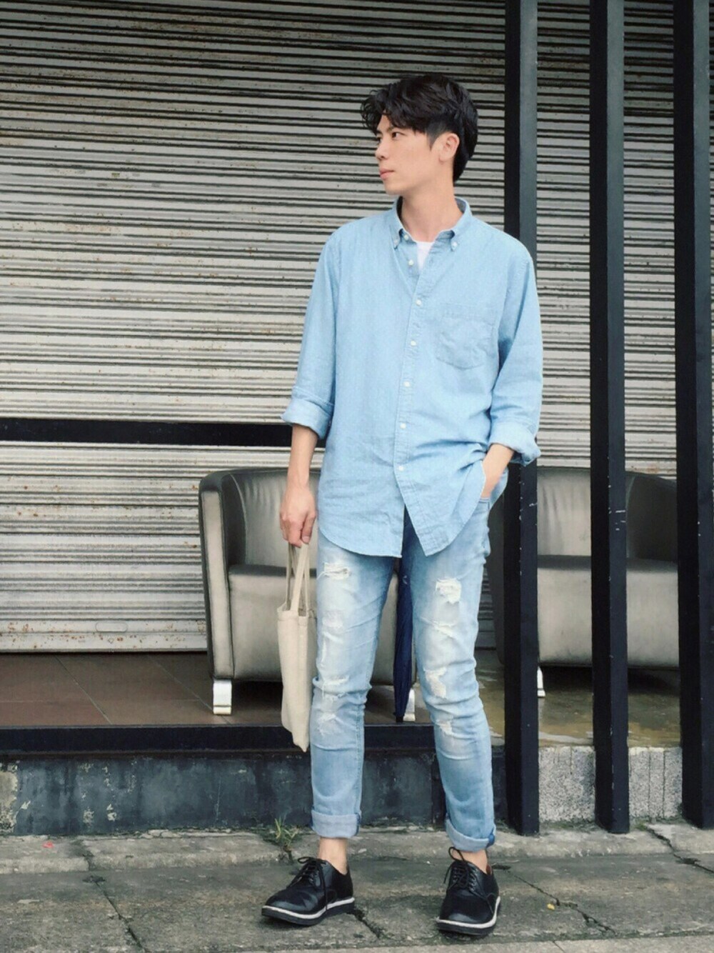 ブルー系のシャツ/ブラウス、ブルー系のデニムパンツを着用したメンズの夏コーディネートの1枚目の写真