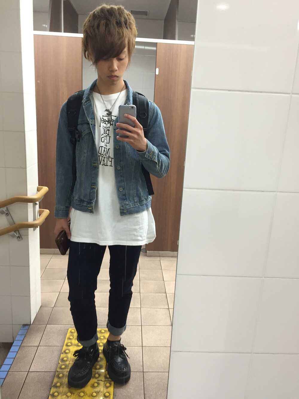 サイズ大きめのTシャツにタイト目なデニムジャケットを合わせ ゆったりとした感じ。