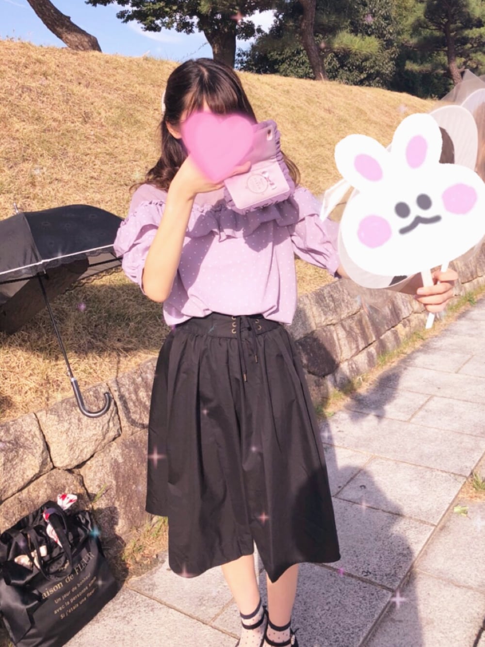 先日の現場コーデです。 紫ばっかり身につけて現場行ったらメンカラ紫の子の担当だと勘違いされまくった。間違いではないけど₍ ᐢ. ̫ .ᐢ ₎ わかりにくくて申し訳ないけどスカートはウエストがキュッてなってるけど全体的にふんわりしてめっちゃ可愛いです😇 大人に見られたくて、ミニスカート辞めました🐷💗