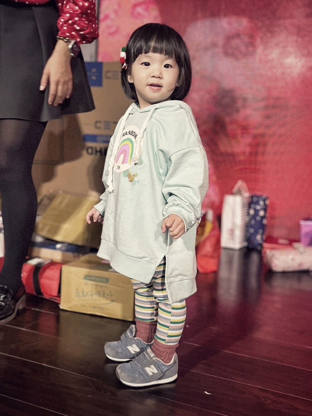 グリーン系のトップスを着用したキッズの冬コーディネートの1枚目の写真
