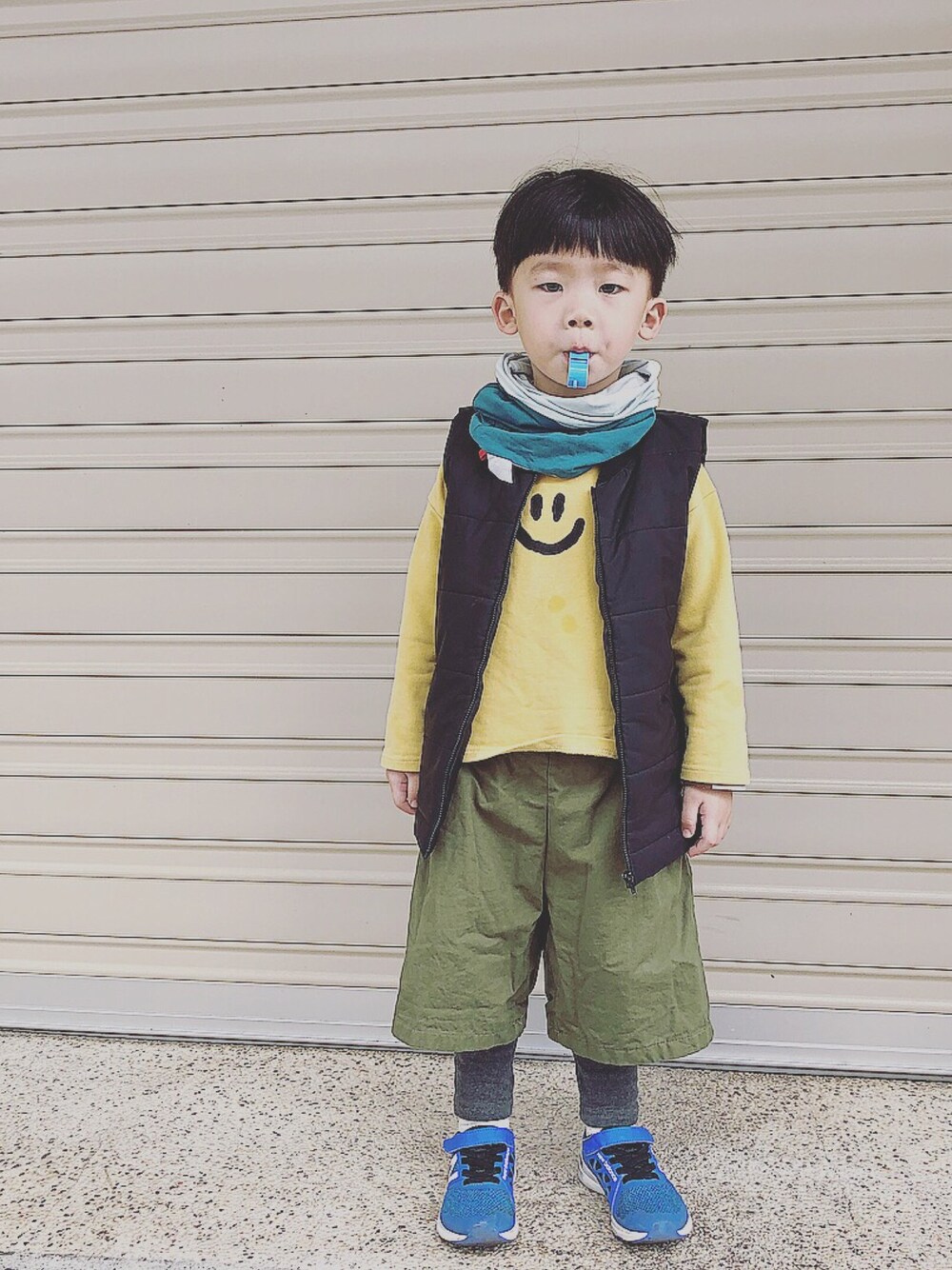 イエロー系のTシャツ/カットソーを着用したキッズの冬コーディネートの1枚目の写真