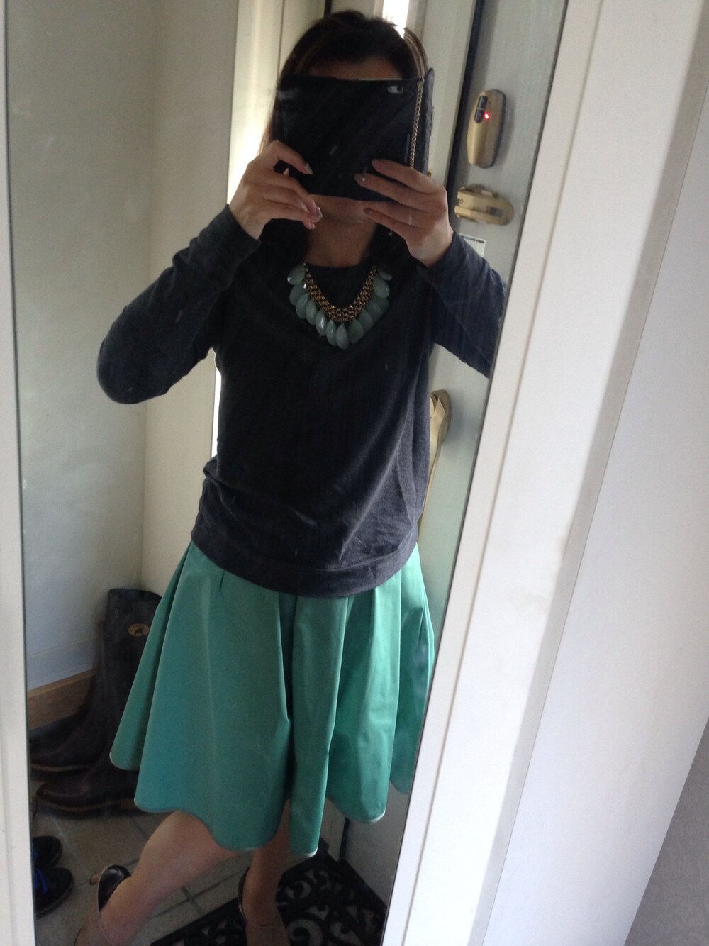 スカートに合わせてネックレスを同じお色のビジューネックレスで