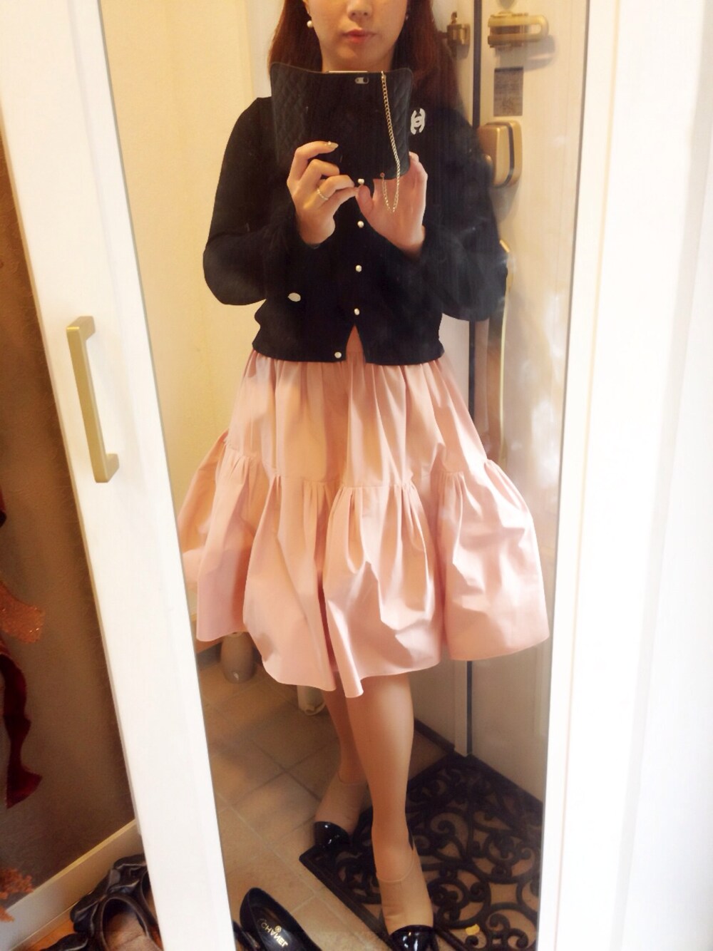 ふわふわのスカートにピタッとした黒のパーカーで。