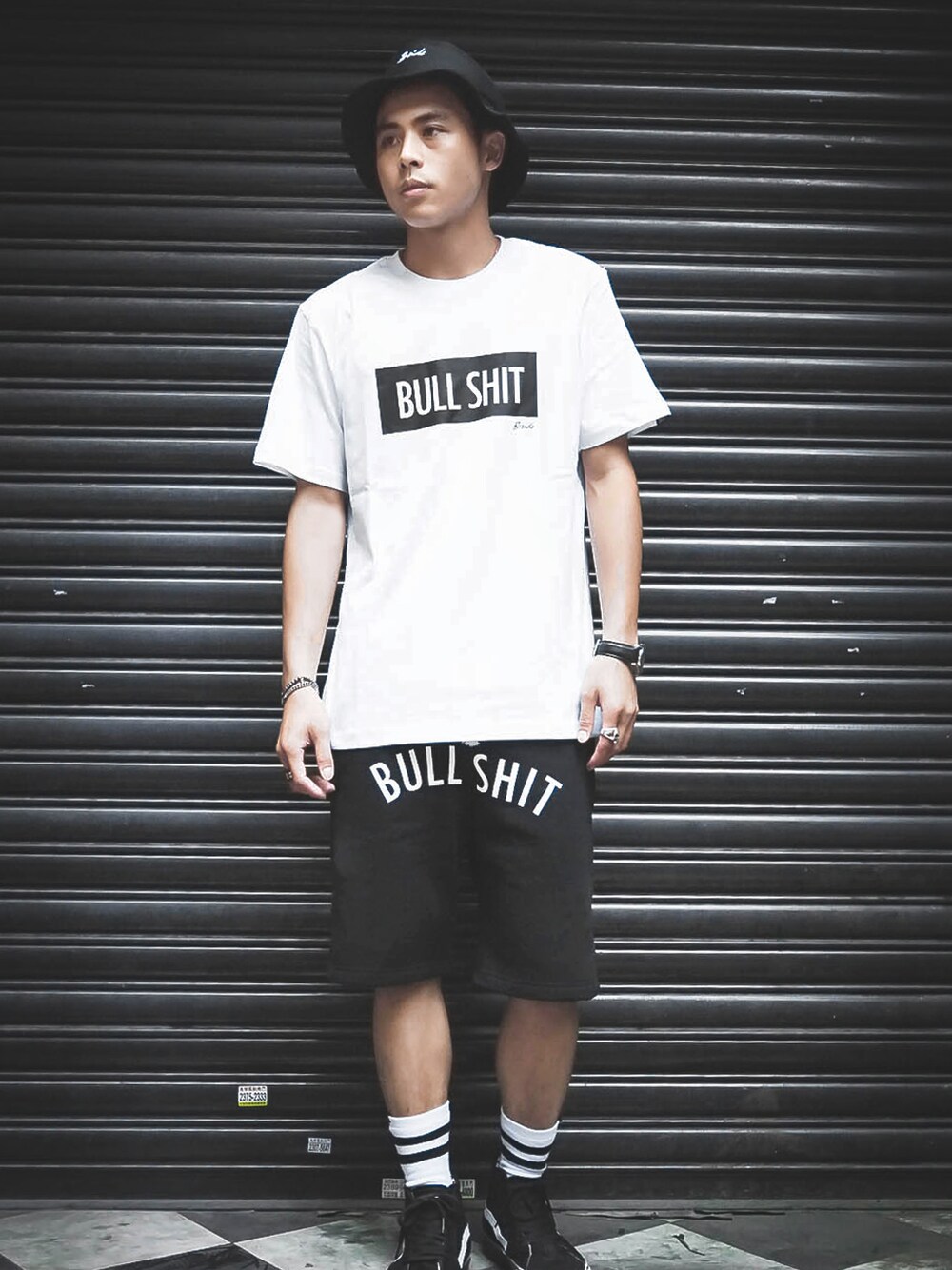 HAT:BASIC BUCKET HAT TOP:BULLSHIT TEE PANTS:BULLSHIT SHORTS ACC:7th SOCKS