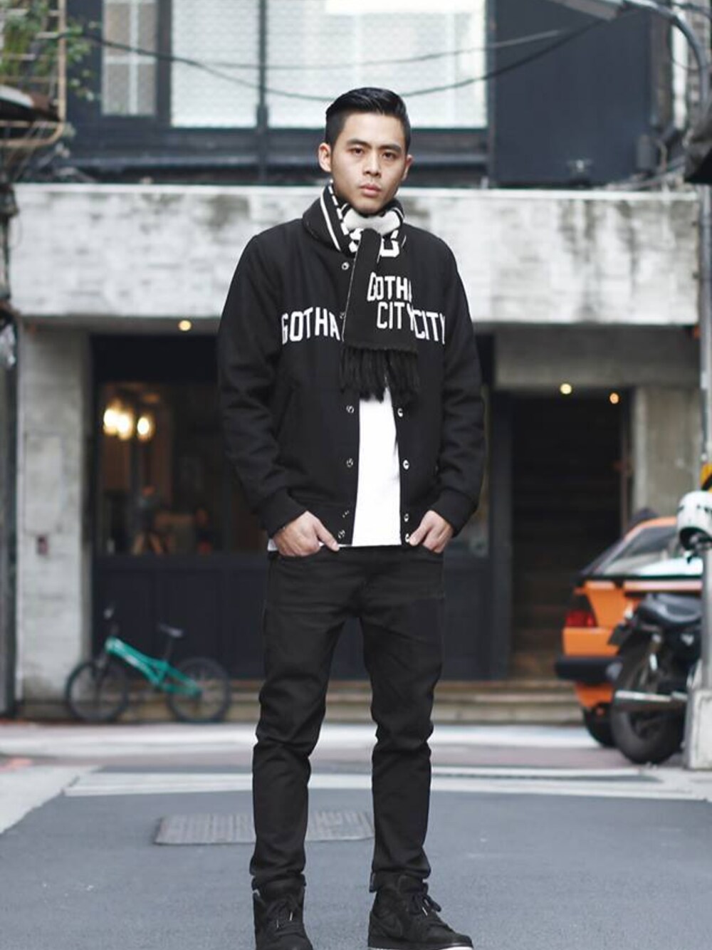 B-SIDEのスタジャン「GOTHAM CITY BASEBALL JKT」を使ったコーディネート