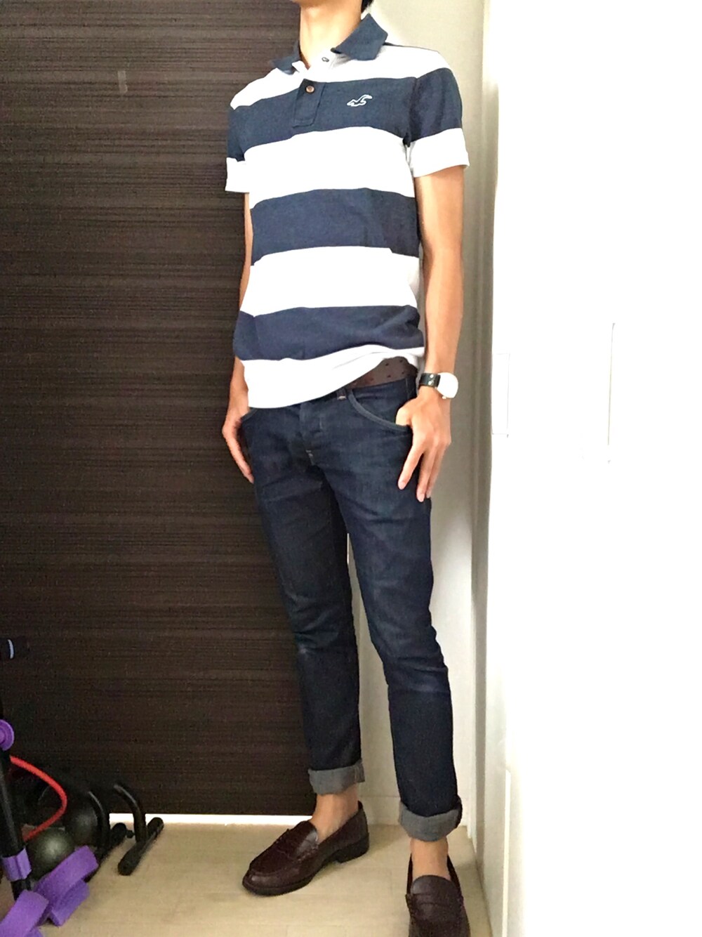 久々ボーダー着てみましたー😆 このポロシャツのボタンが好きです✨ そしてスキニージーンズ×ローファー ローファー意外と履き心地いいですね!