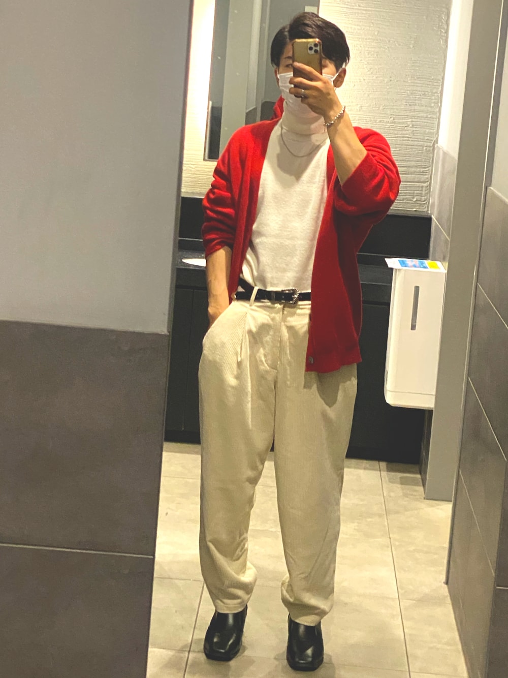 上下真っ白ではなくて少しくすみがかかったズボン(オフホワイト)に上は今年流行りのビビットカラーの赤いカーディガン! そして黒色のブーツで引き締める!