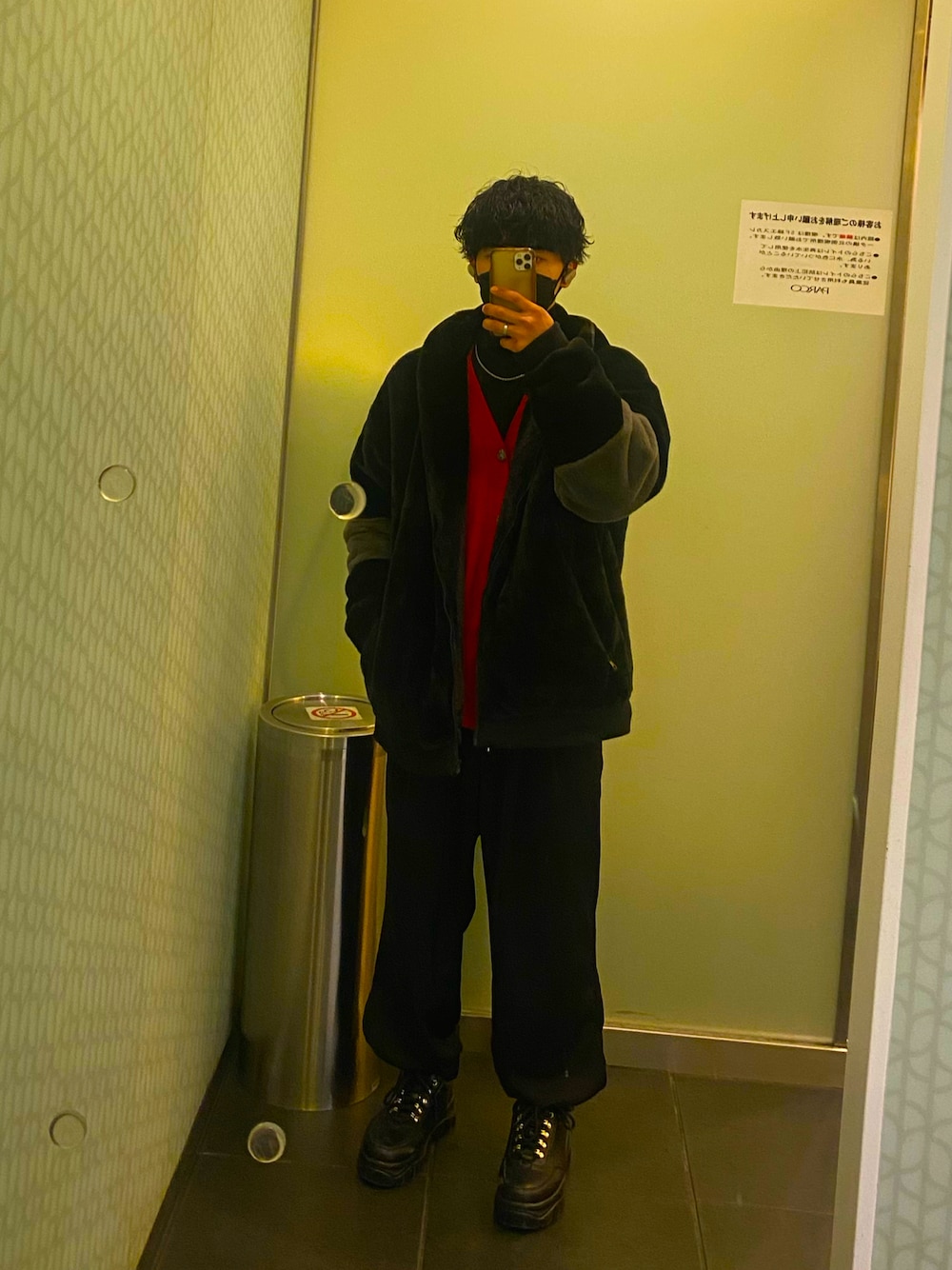 夜はまだ寒いのでアウターは必要! ファーアウターお気に入り! 差し色で赤色のカーディガン!赤と黒は相性良き!男性ウケ!全体的にゆったりめ!
