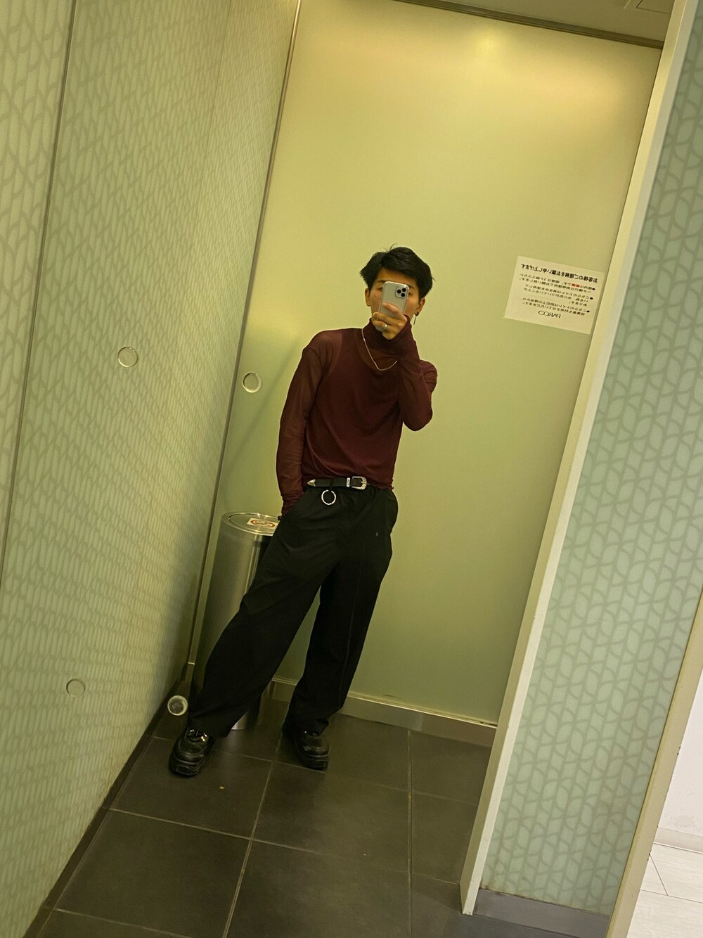 カジュアルコーデ! 黒と赤! 肌スケスケ〜