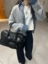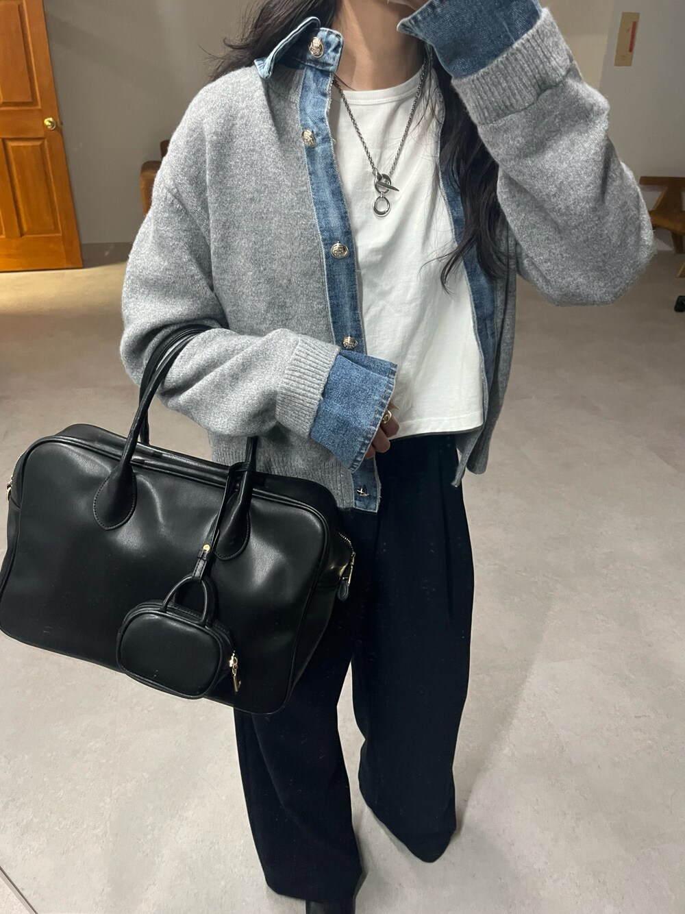 トレンドの異素材ドッキングカーデ♡ 🏷️yuue' ( wear ) デニム異素材ドッキング 襟付きニットカーディガン 🏷️soins 【牛革】ミニバッグチャーム付きスクエアボストンバッグ