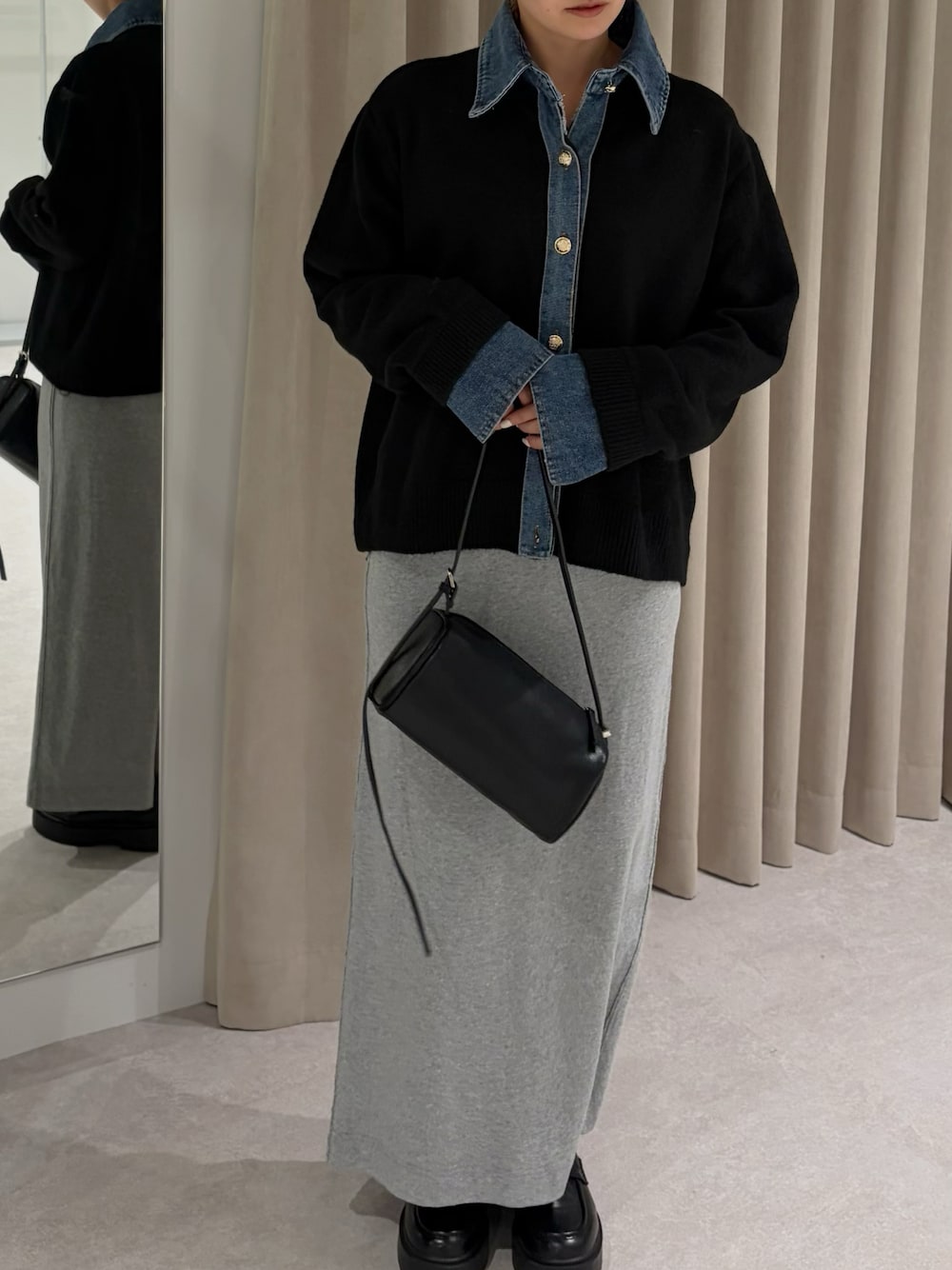 このカーディガン、ゆるっと楽ちんなのに、デニム切り替えできちんと見えするのありがたい~! 小物は黒で揃えました。 🏷️yuue' ( wear ) デニム異素材ドッキング 襟付きニットカーディガン 🏷️soins 【牛革】ミニマムハンドバッグ