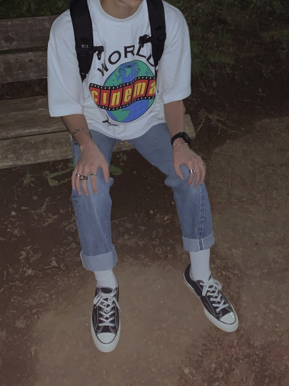 初デニムでリーバイスのvintageは最高☺️ ただウエストが70くらいだからめちゃくちゃキツキツ笑 tシャツはサイズ感とロゴがいい感じ🙆🏻♀️ スニーカーは古着屋でかったct70 履き心地が最高すぎてやめられん笑