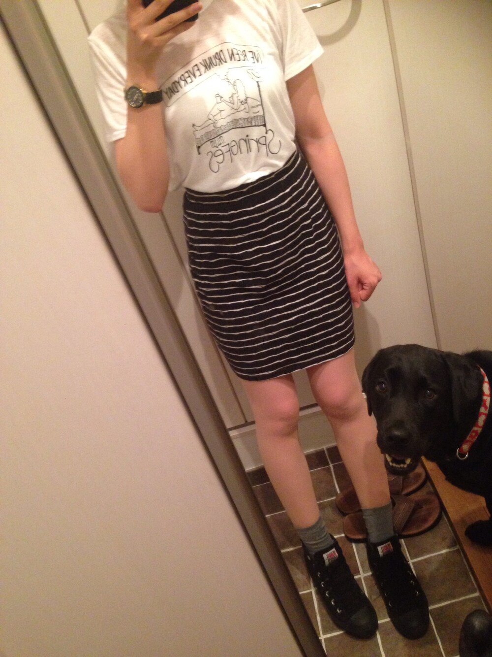 Tシャツ×SLY スカート×moussy 靴下×無印 シューズ×VANS 写真撮ろうとしたら丁度リリがきて 鏡越しにカメラ目線とゆーナイスショットが とれました(^_^)☆笑 VANSのこのシューズはインソール付きなので 脚長効果抜群です👏💫 皆さんのところは台風大丈夫でしたか?