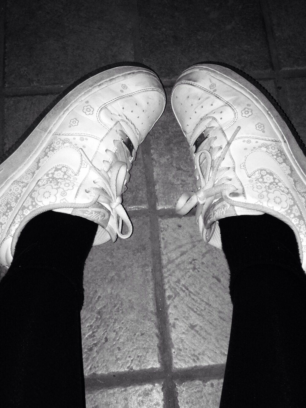 NIKEのスニーカー。 真っ白なんだがお花が書いてある。 描いてある?というか彫られてる?というか。 まぁお花がある。