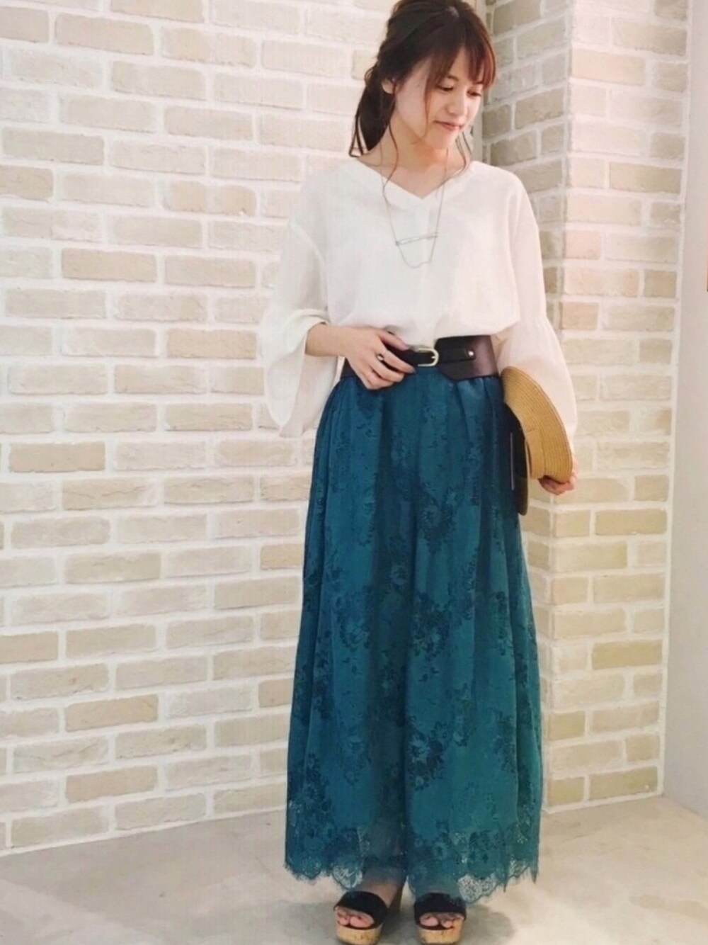 グリーンの色が綺麗!💓 マキシ丈で、私の身長だと足首がチラチラ見える長さです! TシャツもいいけどVネックのリネンシャツできれいめに⭐️ フレア袖もポイントです♩ ベルトを付けるだけで引き締め効果! きれいめ過ぎないようバランスをとりました🙆♀️
