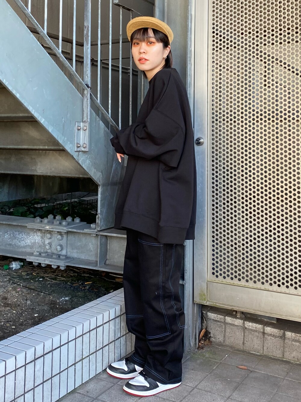 インスタ、TikTok bubumin325 オールブラックにベージュ帽子で 暗すぎないコーデに