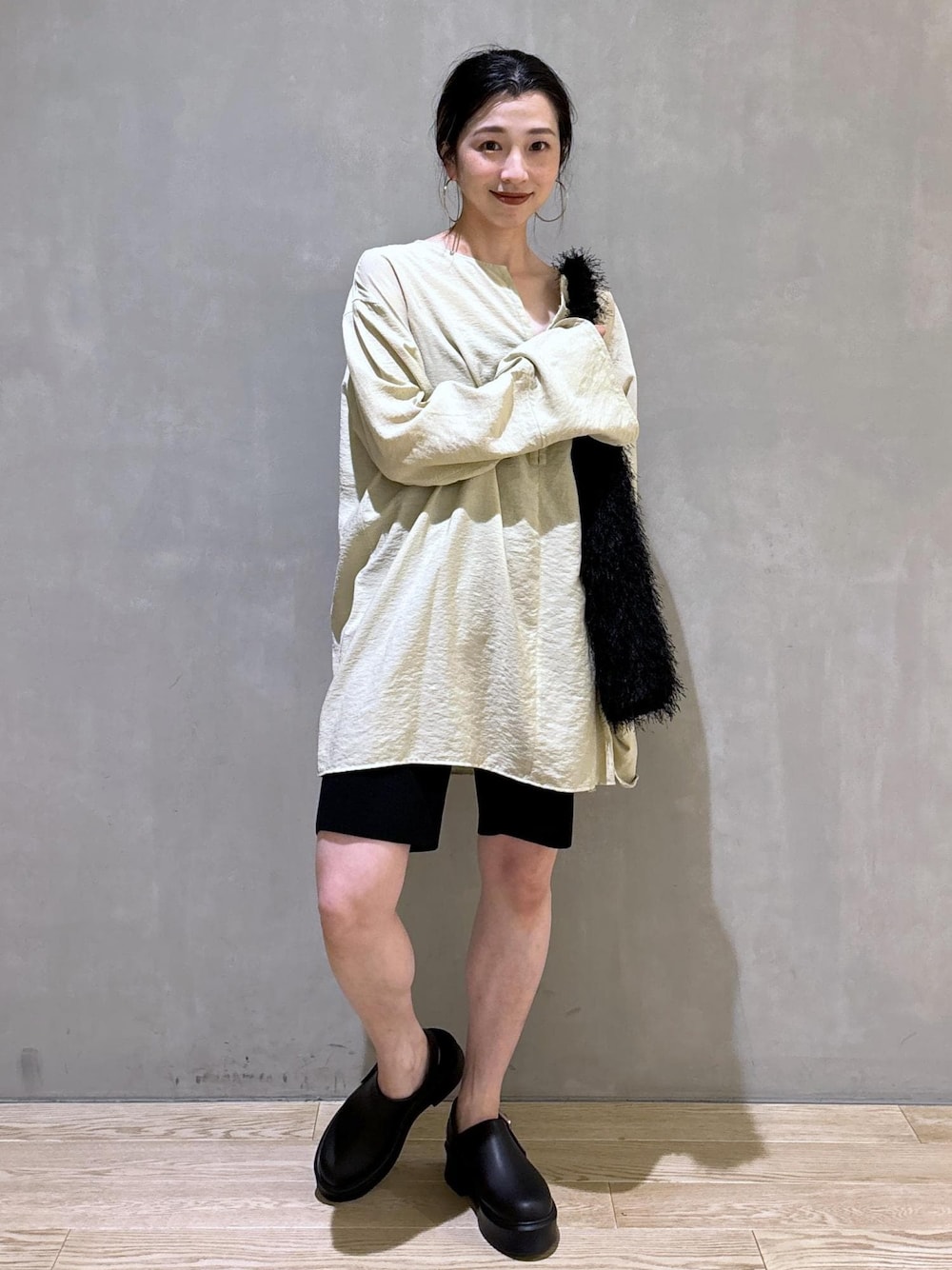 こんにちは! 心斎橋PARCO店の畑です。 いつもご覧いただきありがとうございます! 今回は以前ご紹介した2WAYリネンロンTEEブラウスの着回しコーディネートのご紹介です。 以前はフェザー素材のパンツでコーディネートしてみたのですが、今回はサイクリングパンツとカジュアルダウンしてみました!こちらのブラウスをチュニックのように合わせてみました!かなりの高身長の方だとバランスが難しいかもしれませんが、低身長の方ですとショートパンツとの合わせでワンピースのようなバランスで合わせれるところもとても素敵ですよね! 足元が軽くなりすぎないよう、新作のボリュームソールのシューズで合わせてみました! ぜひ気になる商品がございましたらチェックしてみてくださいね!!