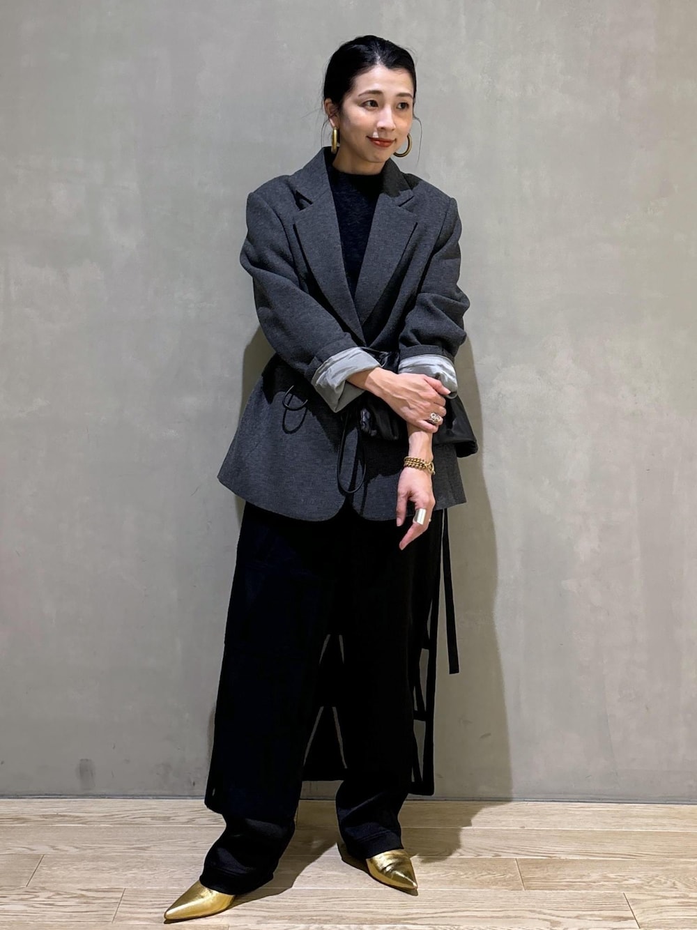 こんにちは! いつもご覧いただきありがとうございます! 心斎橋PARCO店の畑です。 今回はブラックのワントーンスタイルのご紹介です。 ニットにパンツというシンプルなスタイルですが、フォックスの素材感が引き立つようなとろみ感のあるパンツで上品にまとめてみました! シンプルなのでスカートをレイヤードし、少しアクセントに。 ボンディングジャケットはオーバーサイズなのでアウター代わりにもおすすめですよ。レザーのバッグでウエストマークすることで、低身長でもバランスよく見えるようにアレンジしてみました! ぜひ気になる商品がございましたら、チェックしてみてくださいね! ●bag AMOMENTO ¥48,400(tax in)