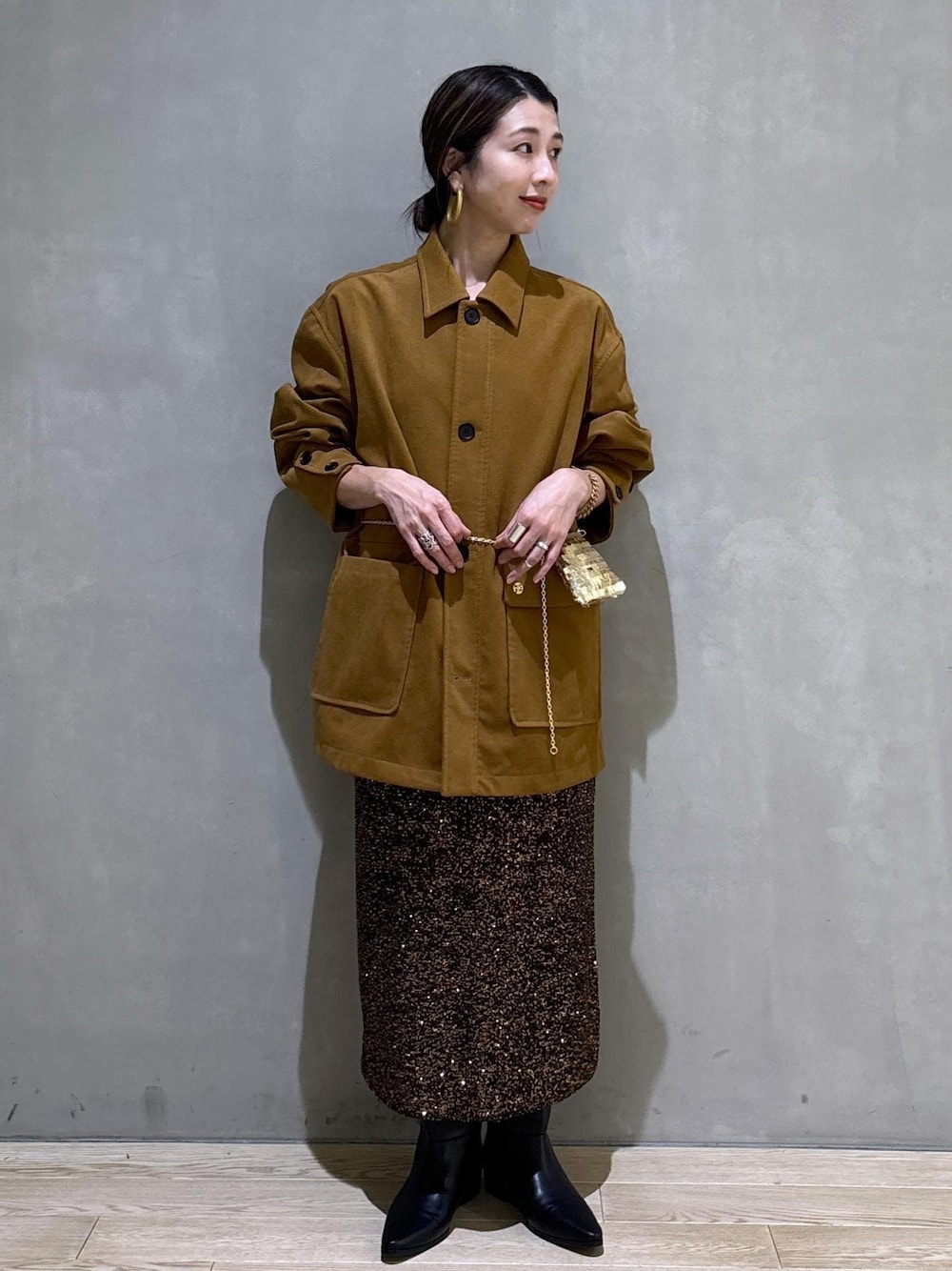 こんにちは! 心斎橋PARCO店の畑です。 いつもご覧いただきありがとうございます!! 今回はキャメルカラーでコーディネートしてみました! スパンコールのスカートもゴールドカラーでキャメルが良いので一緒に合わせても素敵ですよ! スウェード素材のブルゾンとスパンコールの個性あるスカートを合わせてもカラーをまとめると上品に合わせていただけます。 是非お試しくださいね!!