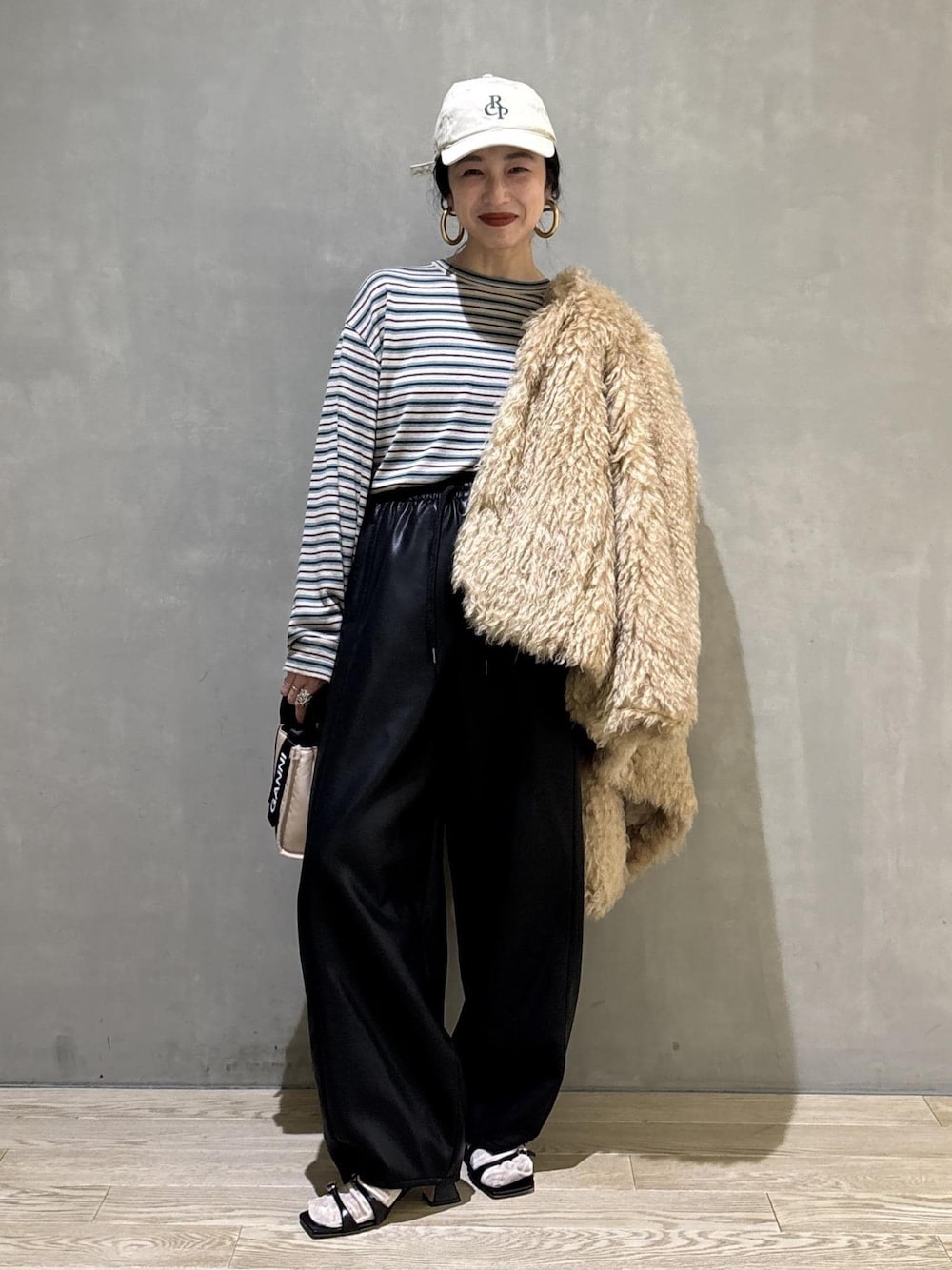 こんにちは! アダムエロペ心斎橋PARCO店の畑です。、 いつもご覧いただきありがとうございます! 今回はボーダートップスとレザーパンツでカジュアルにスタイリングしてみました!かなりストリート感も強いので、あえてそちらにSteiffファーコートを合わせ、ヒールバランスで、カジュアルさを中和させた大人のストリートスタイリングです。 ぜひ参考にしていただけますと嬉しいです。