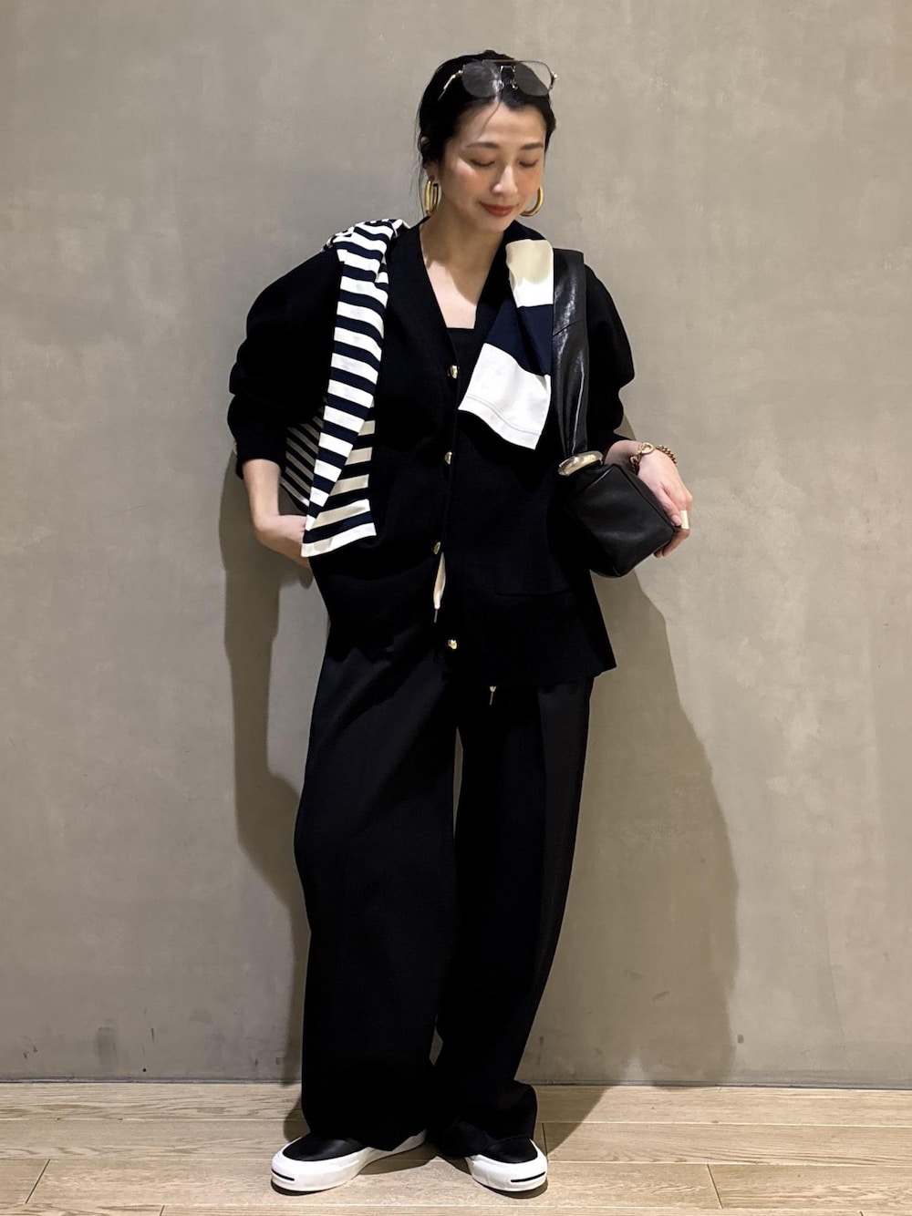 こんにちは! 心斎橋PARCO店の畑です。 いつもご覧いただきありがとうございます!! 今回は毎シーズン大人気のロゴボタンミドルカーディガンを使ってモノトーンスタイリングでカッコよくコーディネートを組んでみました! ゴールドボタンやシルエットがとても上品なカーディガンですが、あえて小物やシューズはカジュアルダウンし、綺麗めなスタイリングをカジュアルに落とし込んだ大人なスタイルです。 サングラスなどの小物もアクセサリー感覚で取り入れたところもポイントですよ!