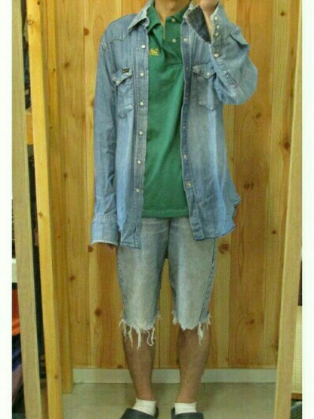 デニムシャツ(ラングラー 15.1/2-34) ポロシャツ カットオフジーンズ(リーバイス505/コロンビア製/W31少しオーバーサイズです。) 全て古着です。 サンダル(100均) 同様の商品は販売しております。 古着&ビンテージ『BUFFALOHIP/バッファローヒップ』 staff