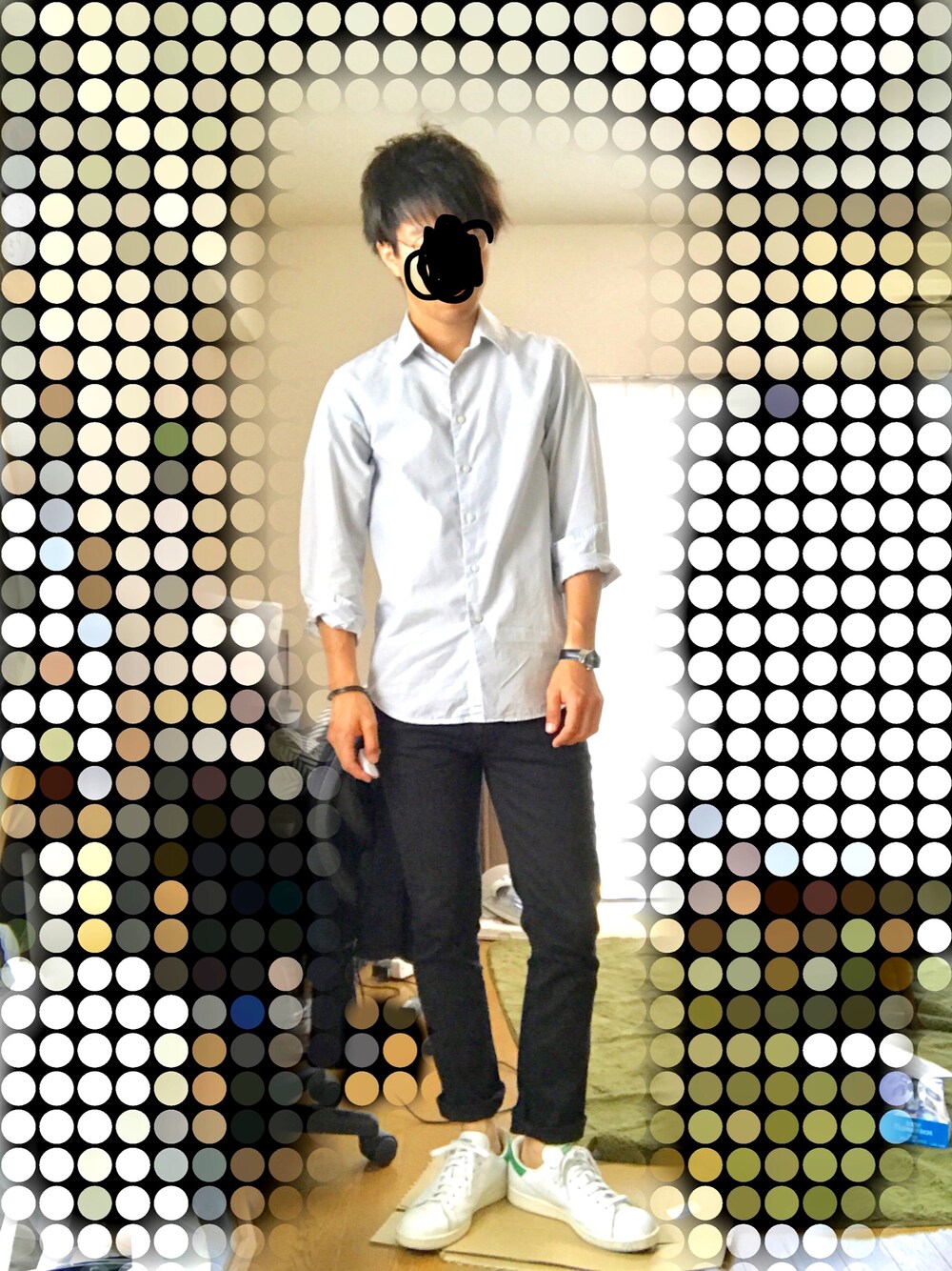 スタンダード! シャツは淡いブルー、スタンスミスでドレカジ7.5:2.5くらいの比率になったかな。 これくらいの方がウケがいい気がする。