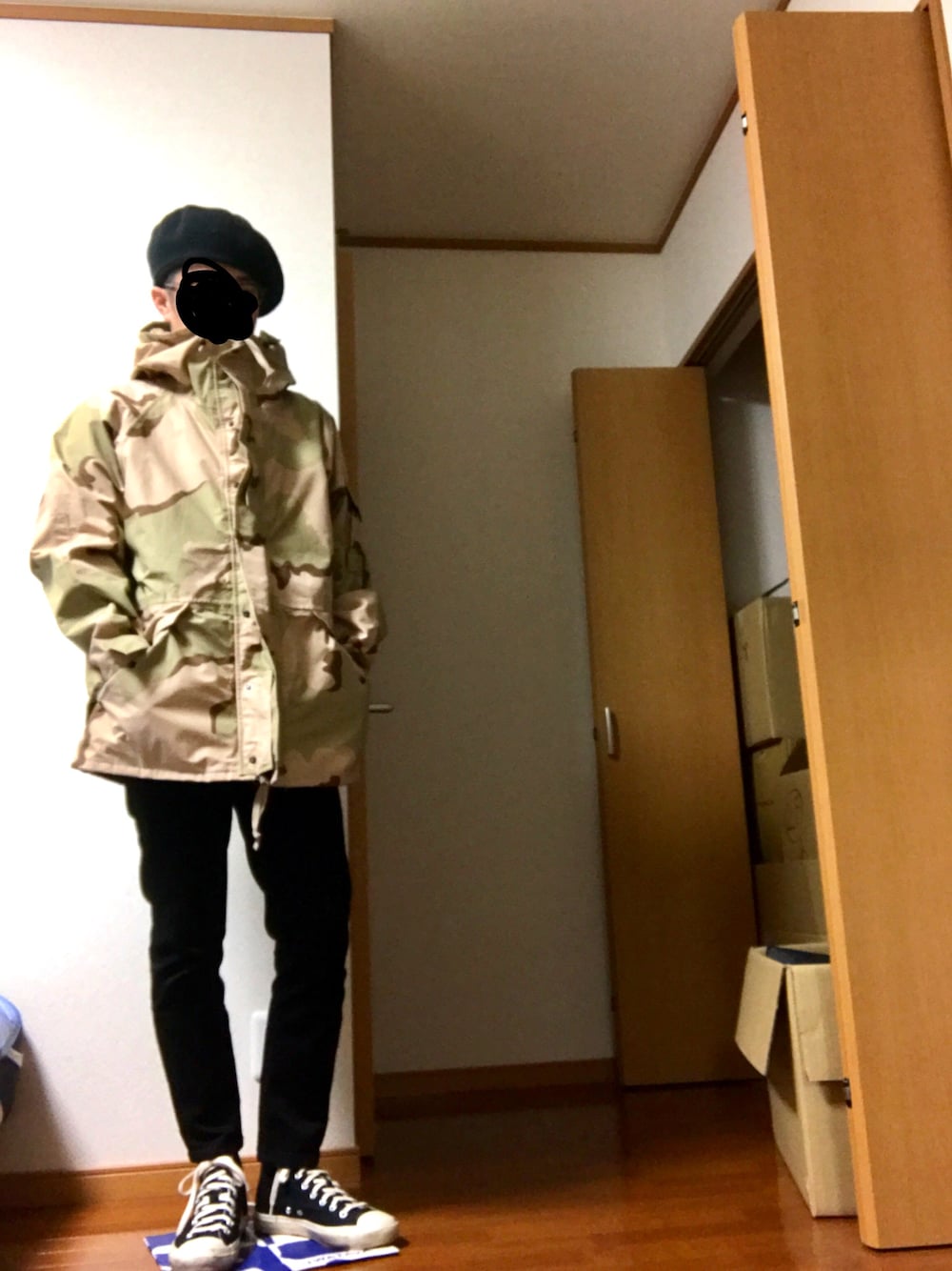 ecwcs M-Rでデカめなのでヤフオクで7000円で落札しました。 パンツをスキニーにしてYライン。 スラックスでもいいかも。 その場合はシルエットを誤魔化すためにストールでもまいてリュック背負えばいいかな〜。 安くて丈夫でかっこいいからecwcsおすすめですよ〜!