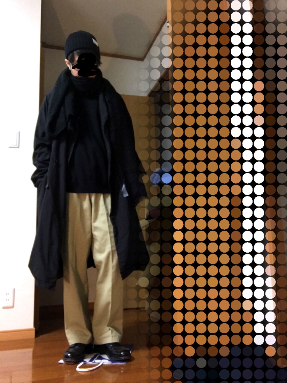 ディッキーズを映えさせる為に黒で抑えました。 ニット帽やストール、パンツのクッションで視線を散らすようにしました。