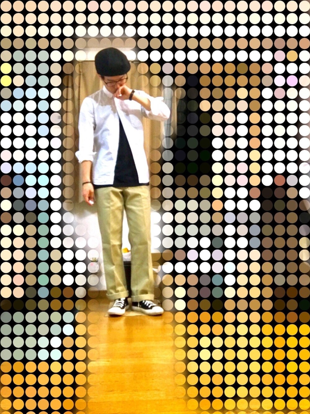 Dickies コーデその4 今回もどカジュアル。 靴はムーンスター。 モノトーンプラス一色でまとめました。 少しドレス感を出すために第1ボタンをとめてみました。 Tシャツの着丈で腰位置隠したつもりですが、パンツと靴の境界がはっきりしすぎていまいち。 まあでもよし。