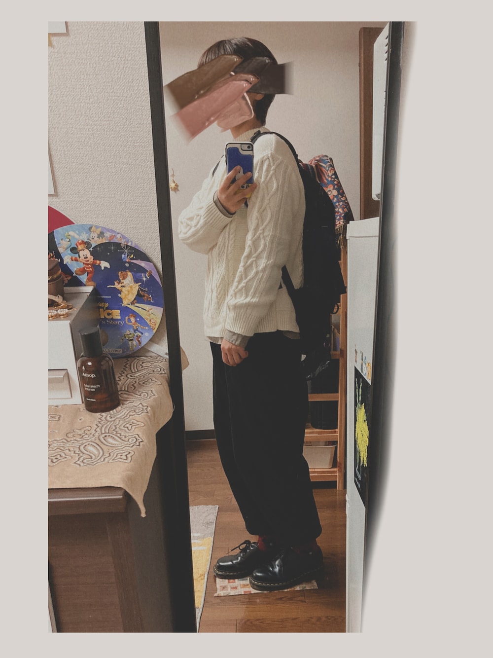 今日もモノクロコーデ、 靴下に赤を入れたりするのが好きです。 ニットもズボンもゆったり。 このマウンテンスミスの黒リュックがお気に入りで、5年は使ってる。リュックの中の生地が真っ黄色なのがまた可愛い。 投稿1週間続いた…えらい! #relive - toconoma