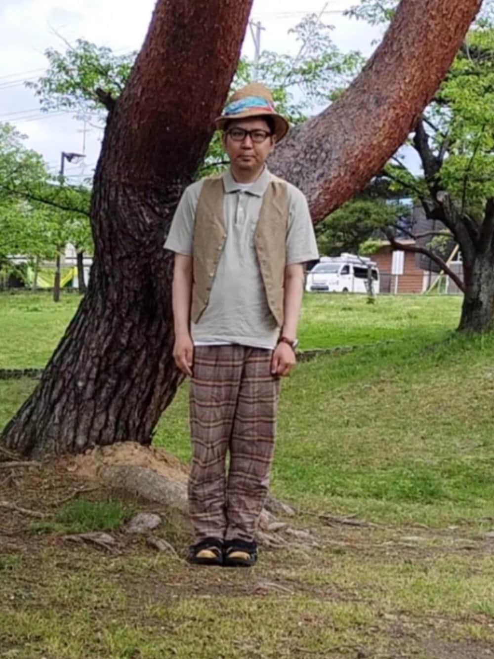 花柄のベストにチェックのパンツで柄柄にした分、色を抑えめにしたコーディネート。 麦わら帽子に猫柄のバンダナを巻いたのがポイントです。