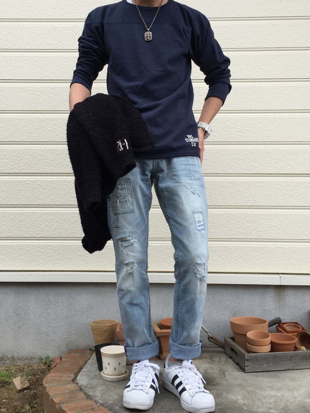 リーニョスのデニムパンツ「《三浦理志さん着用アイテム!》≪カジュアル派必見≫BAYFLOW/リペアテーパードデニム」を使ったコーディネート