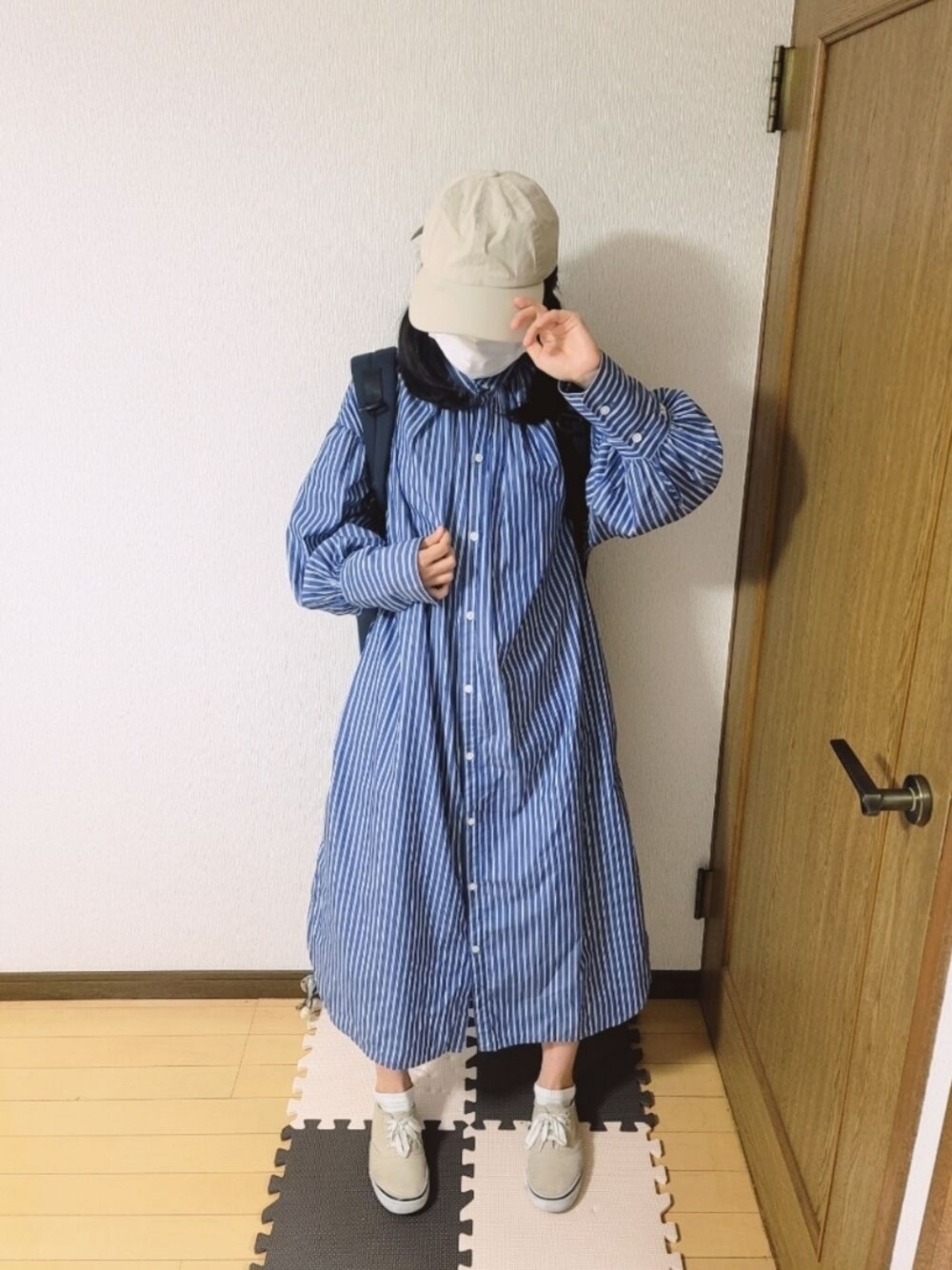 いつもフォロー、フォルダーイン、コメント、お気に入り、いいねありがとうございます。 今日はお洋服としてはシャツワンピース1枚で纏めたシンプルなコーディネートです。 このシャツワンピースは貰い物なのですが、ストライプが縦ラインを強調してくれて、しかも私の身長的に脚の本当に細い部分しか見えないので、とても細見え効果、小さく華奢見え効果があるなぁと思っています。 ワンピースの配色が青と白なので、相性の良いベージュを合わせてみました。 所で実はまたセーブ?という言葉の意味が分かっていません。