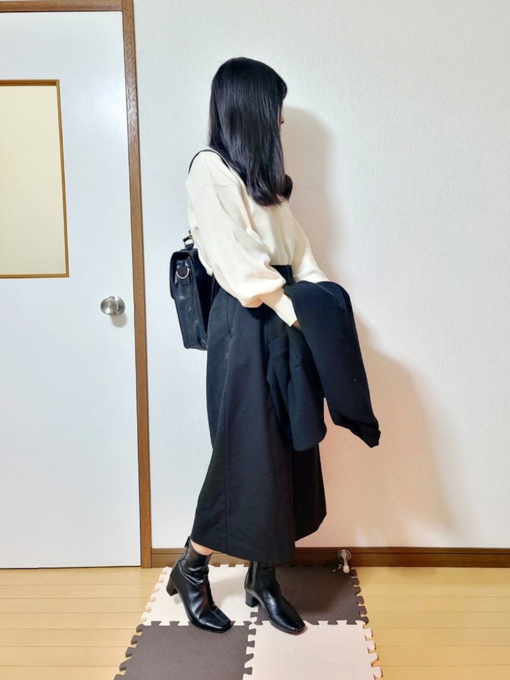 いつもフォロー、フォルダーイン、コメント、お気に入り、いいね、そしてご覧頂き誠にありがとうございます。 本日は今日のタグにもあります、モノトーンでまとめてモードを意識したコーディネートです。 テーラードコートとガウチョパンツと、両方Aラインにやや広がったシルエットがお気に入りです(^-^) 小物は革系でまとめて、コーディネート全体の引き締め効果を狙ってみました。 上下共にゆったりしたシルエットなので、ウエストにはガウチョパンツと同素材のベルトをして、体型のメリハリを出す事も意識しています。