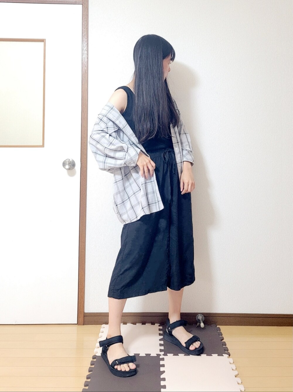 いつもフォロー、フォルダーイン、コメント、SAVE、いいね、WANT、そしてご覧頂き誠にありがとうございます。 本日は今日のタグにあります厚底シューズ、では無く厚底のサンダルを使ったコーディネートです。 全体的に黒をメインに、少し珍しいチェック柄のオーバーサイズシャツを合わせてみました。 タンクトップにシャツやカーディガンを合わせるのが最近のトレンドなのか、街中でよく見かけるので私の中でもマイブームなコーディネートとなっております(^-^) 暑いうちに沢山着ておきたいです。