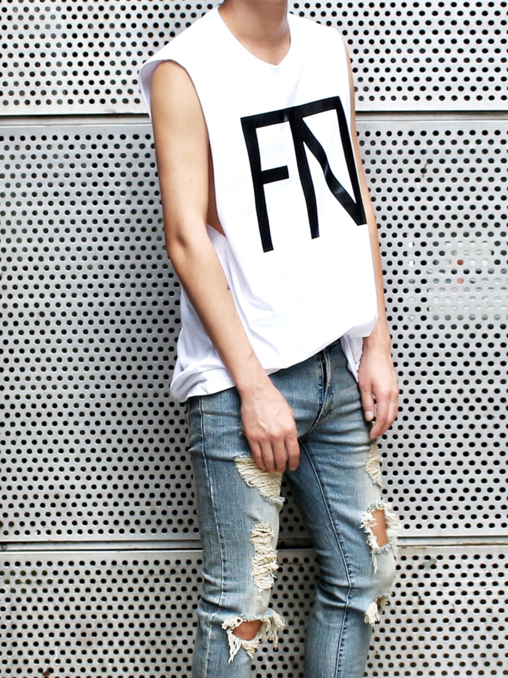 [BUND WALL FIT] 'FREIKNOCK'의 간결한 FN 빅로고를 포인트로 박시한 핏의 크루넥 져지 슬리브리스! 'PERDRE HALEINE'의 디스트로이드 진도 함께 매치해봤어요! FREIKNOCK – Logo Sleeveless T Shirts http://bund.co.kr/pdt/freiknock-024 PERDRE HALEINE – Destroyed Light Blue Jean instagram : @bund_official www.bund.co.kr