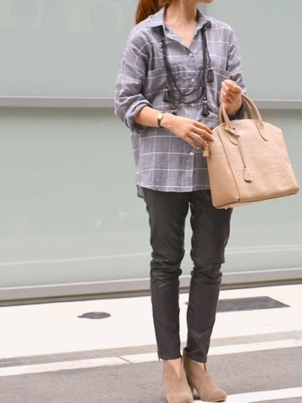 秋レザーのコーディネート 秋のレザーパンツを先取り♪ ゆるシャツを合わせて大人カジュアルに