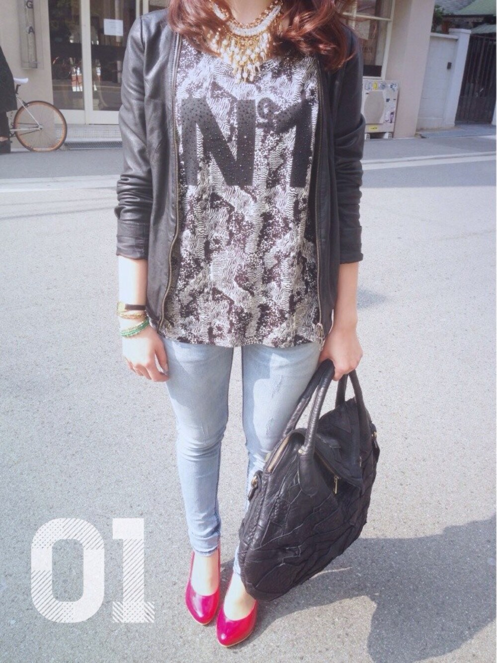bundiのバッグ「2WAYパッチワークレザートートバッグ」を使ったコーディネート