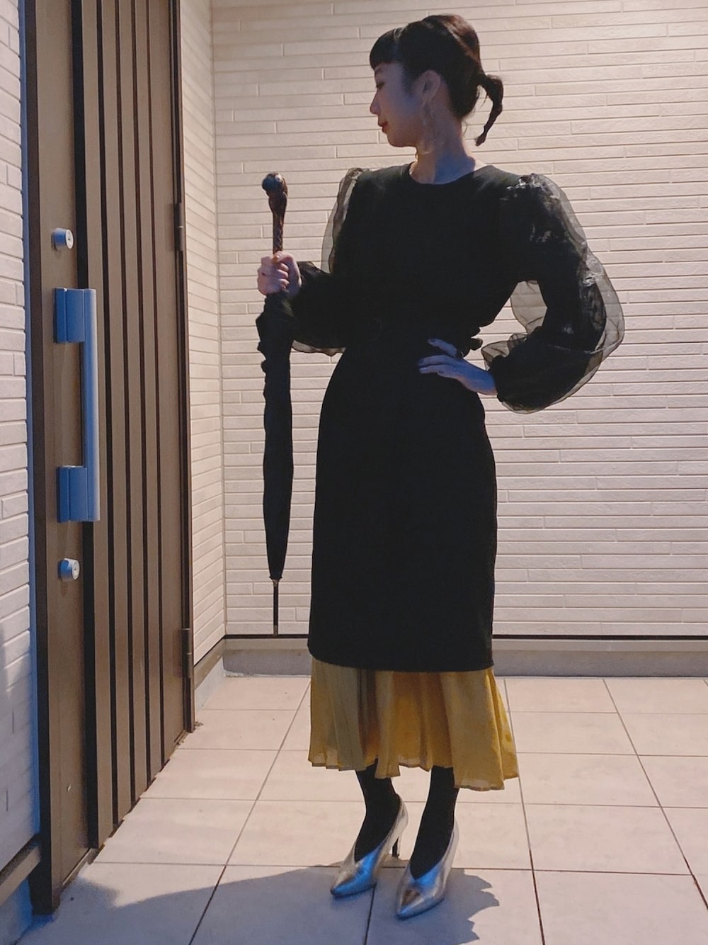 メリーポピンズの傘。私の大好きな傘。雨の日でもお気に入りの傘ならウキウキしますね。 ZARAのトップスにヴィンテージのスカートを重ね着で好きなシルエットにしました。