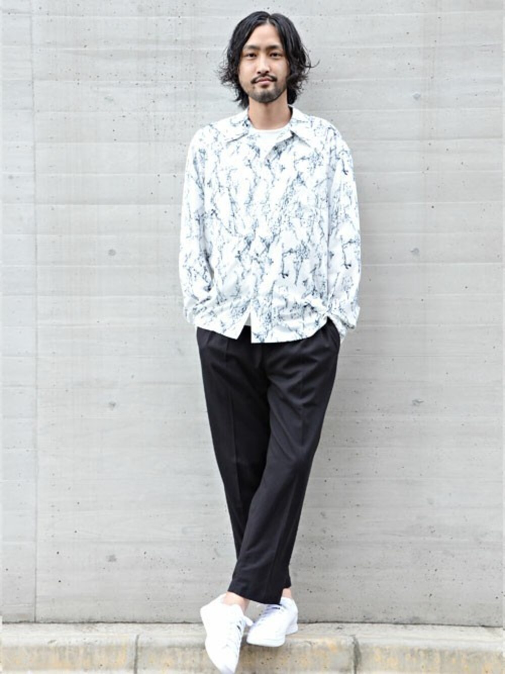 マーブル柄のオープンカラーシャツをワイドパンツで合わせました。