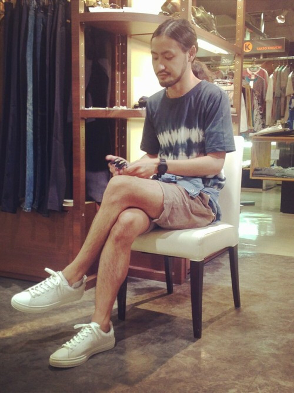 柄Tシャツ1枚でラフにレジャーにオススメスタイルです。 さりげなく腰にシャツでワンポイント。