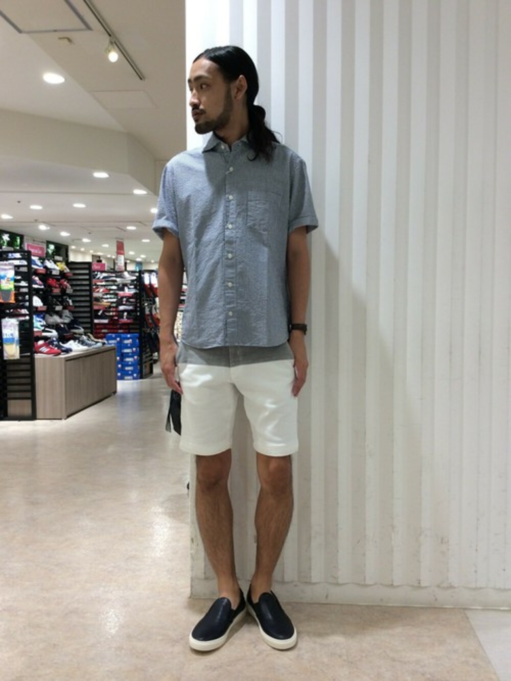 シアサッカー生地で涼しい印象のシャツ合わせにバイカラーショーツで合わせました。