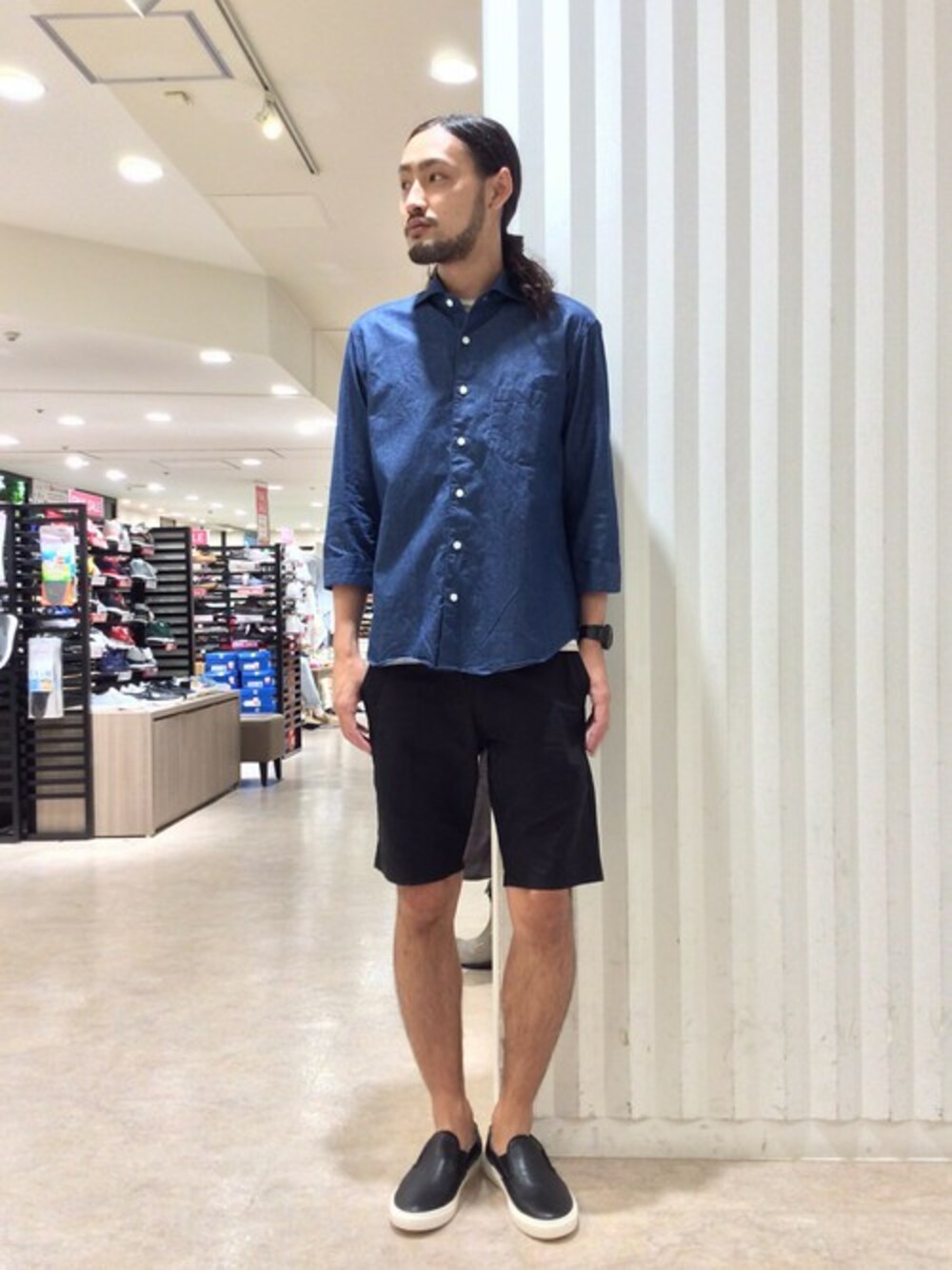デニムシャツとショーツのリゾート感あるコーディネートです。 シャツはあえてボタンを止めてシンプルに着ています。