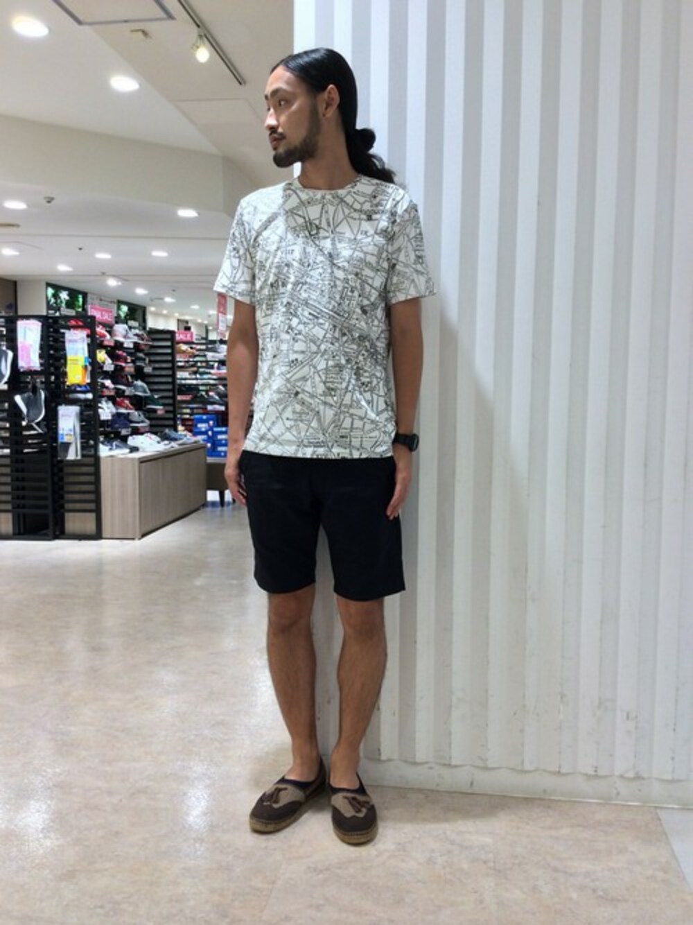 シンプルにTシャツにショーツのコーディネートです。 全面プリントのデザインTシャツですが配色が落ち着いているので 着合わせしやすいです。