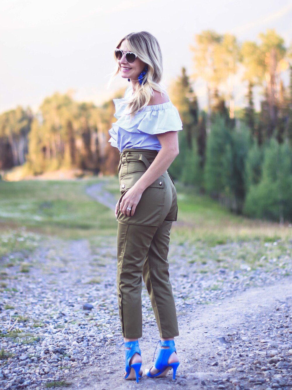 Super sexy cargo pants with ruffle, striped blouse...