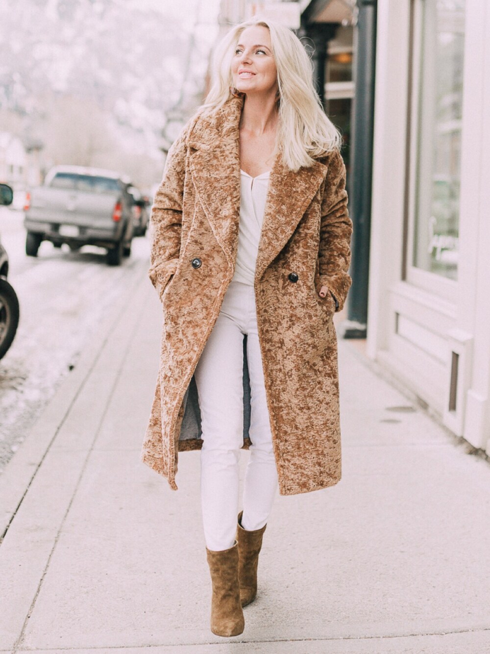 The most gorgeous over-sized, beige teddy coat looks very chic with all white!